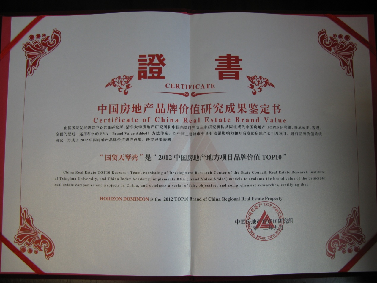 2012年,由中國指數研究院、國務(wù)院發(fā)展研究中心企業(yè)研究所、清華大學(xué)房地產(chǎn)研究所共同組成的中國房地產(chǎn)TOP10研究組,運用科學(xué)的品牌價(jià)值研究方法體系,共同認證“國貿天琴灣”產(chǎn)品系為“2012年中國房地產(chǎn)地方項目品牌價(jià)值TOP