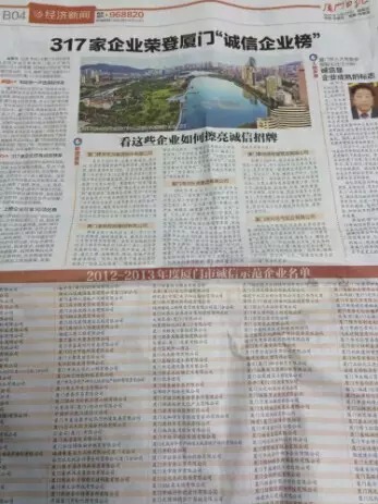 由廈門(mén)市誠信促進(jìn)會(huì )及相關(guān)職能部門(mén)聯(lián)合開(kāi)展的“2012—2013年度廈門(mén)市誠信示范企業(yè)”評選結果日前出爐,今天,廈門(mén)國貿與其它摘得金牌的316家標桿企業(yè)一起接受了表彰。