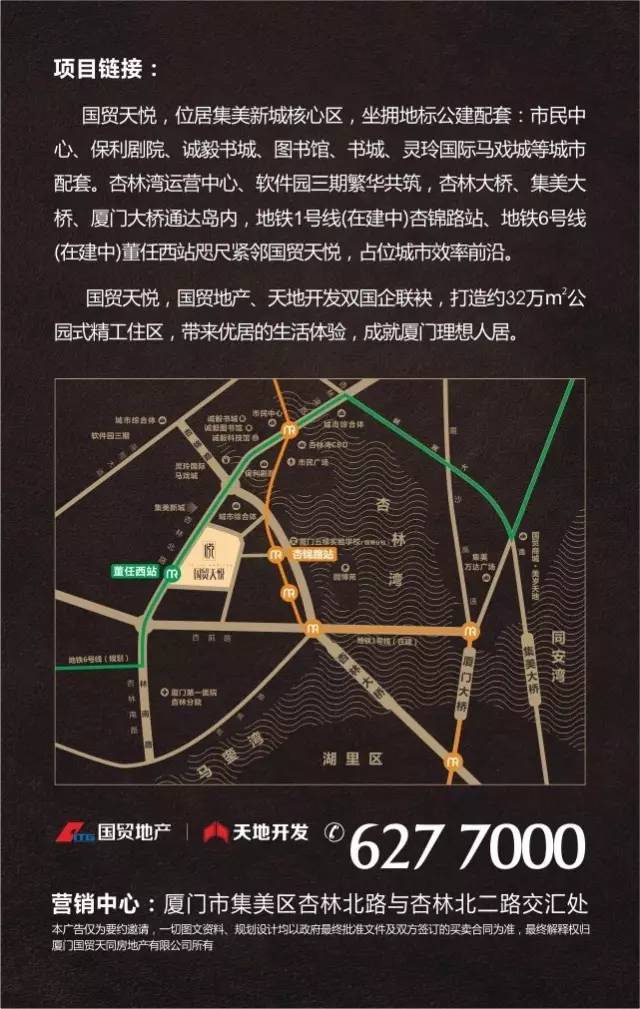 集美大橋、廈門(mén)大橋、BRT樞紐、地鐵6號線(xiàn)(在建中)構成立體便利交通網(wǎng)絡(luò );國貿商城·美歲天地、集美萬(wàn)達廣場(chǎng)、新華都購物廣場(chǎng)享受常伴左右,近享集美老城區的便利生活。目前國貿商城·集悅、國貿商城·同悅臨街鋪全面發(fā)售中。