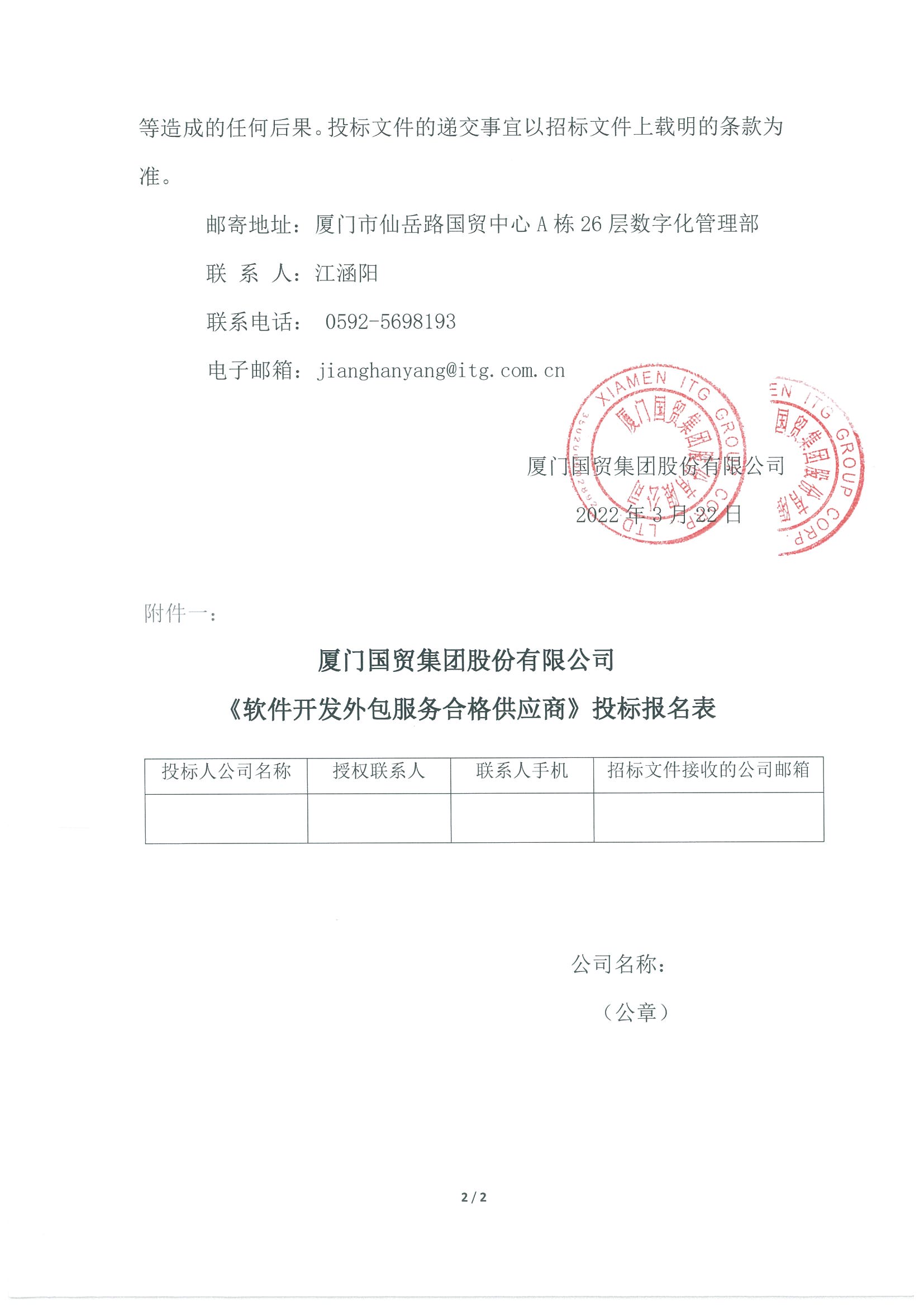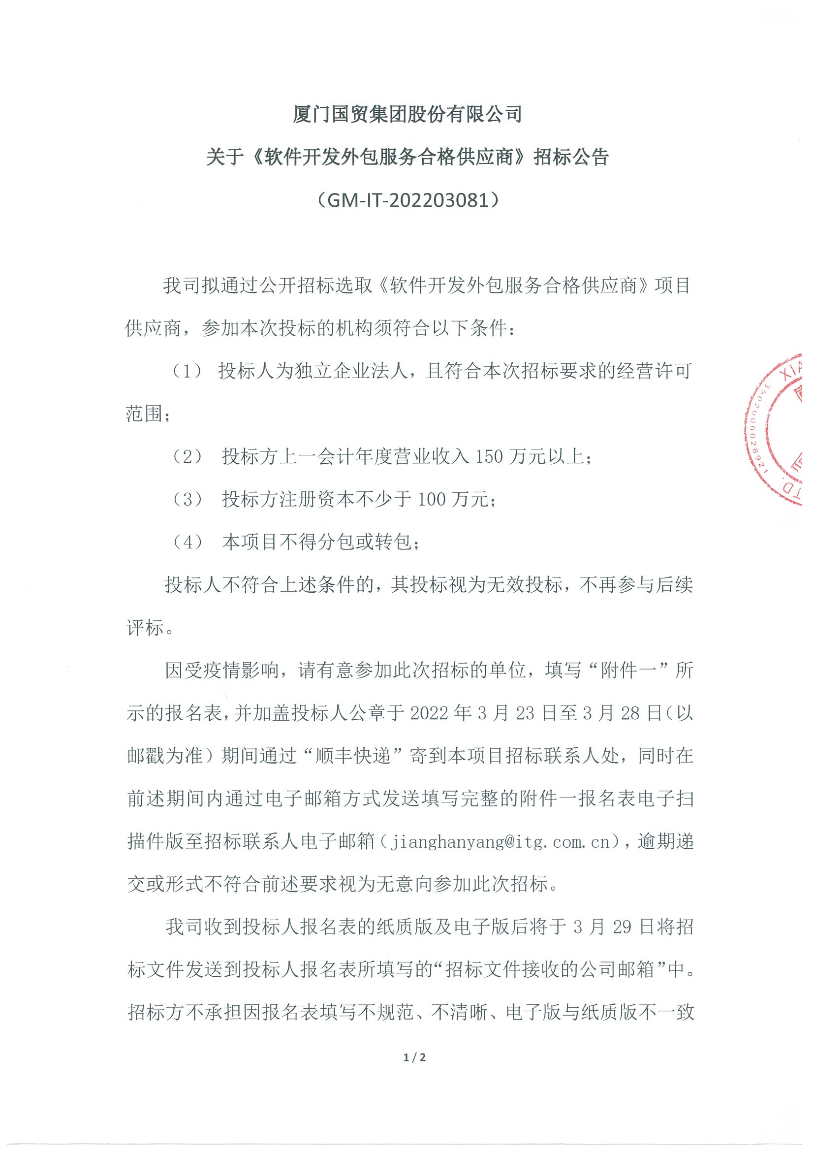 廈門(mén)國貿集團股份有限公司關(guān)于《軟件開(kāi)發(fā)外包服務(wù)合格供應商》的招標公告