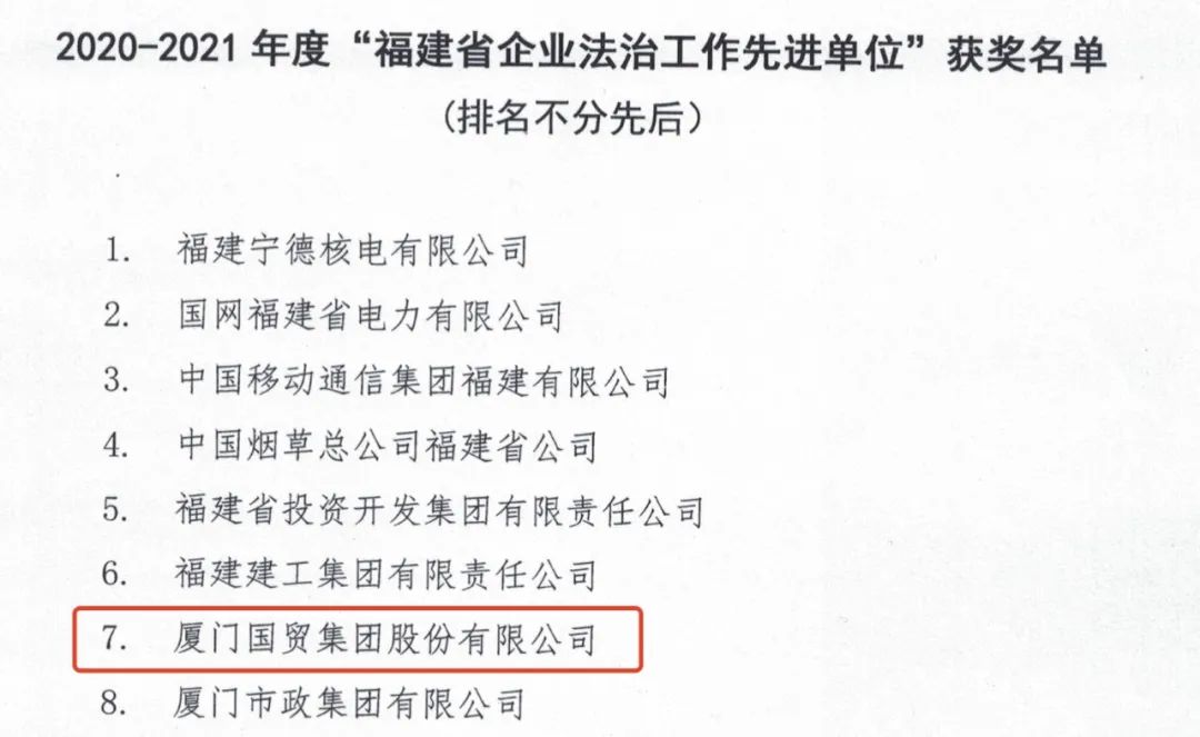 在福建省企業(yè)法治工作表彰中,國貿股份榮獲“2020—2021年度福建省企業(yè)法治工作先進(jìn)單位”稱(chēng)號。這是國貿股份繼獲得“2016-2019年度福建省企業(yè)法治工作先進(jìn)單位”稱(chēng)號后,再度在企業(yè)法治工作方面獲得表彰。