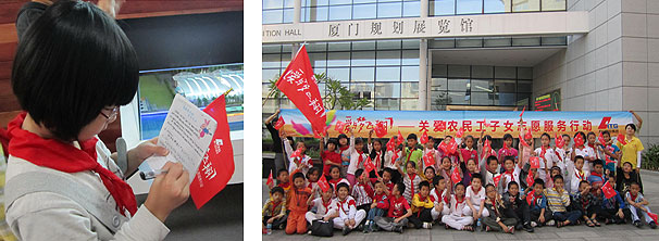 2011年10月,廈門(mén)國貿集團“愛(ài)與夢(mèng)飛翔”志愿者帶領(lǐng)廈門(mén)市文安小學(xué)學(xué)生參觀(guān)廈門(mén)規劃展覽館。在規劃展講解員的帶領(lǐng)下,學(xué)生們親身感受了廈門(mén)的發(fā)展,體驗有趣的環(huán)形影院和各式各樣的最新科技,實(shí)實(shí)在在的了解了每天生活的城市,通過(guò)感受特區發(fā)展,也加深了他們對生活的熱愛(ài),激勵學(xué)生懷抱建設家園的夢(mèng)想,積極向上。